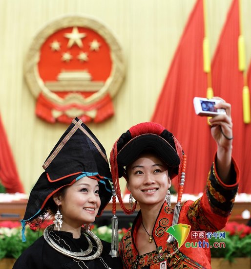 出席会议的少数民族代表格外受到摄影记者的青睐,2012年3月9日下午,第十一届全国人民代表大会第五次会议在人民大会堂举行第三次全体会议