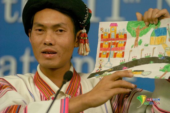 2008年3月10日,在北京出席十一届全国人大一次会议的八位少数民族代表在北京两会新闻中心接受记者集体采访。包布鲁,基诺族,云南省西双版纳景洪市基诺山基诺族乡巴卡完小学教师,向大家展示小学生的绘画作品