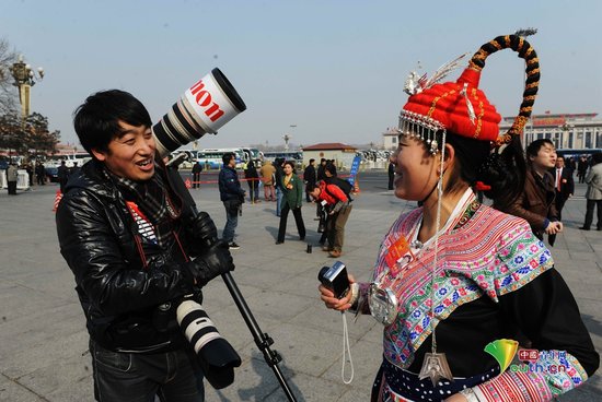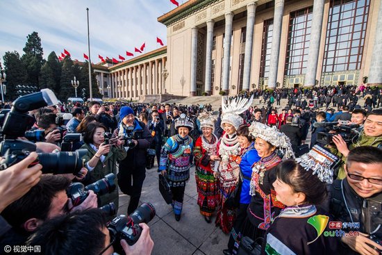 2017年03月05日,北京,贵州代表团少数民族同胞备受媒体记者关注