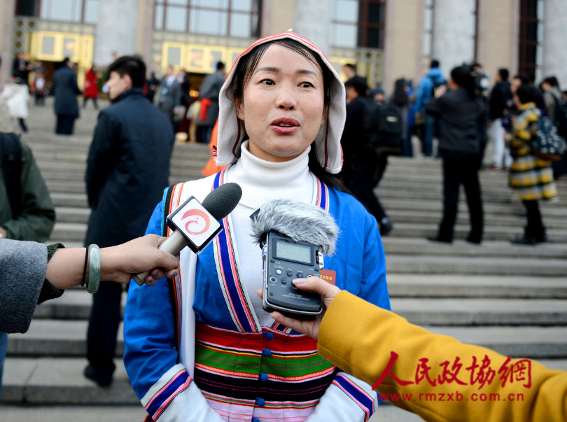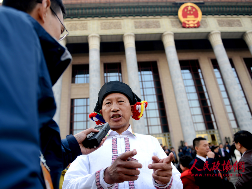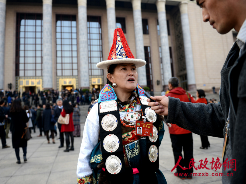 全国政协委员茸芭莘那大会堂前接受记者采访。