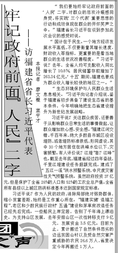 2002年3月4日,《人民日报》两会特刊刊登了一篇以《牢记政府前面“人民”二字——访福建省省长习近平代表》为题的文章,习近平说,“我们要始终牢记政府前面的‘人民’二字,对群众的悲欢冷暖感同身受?!?/p>