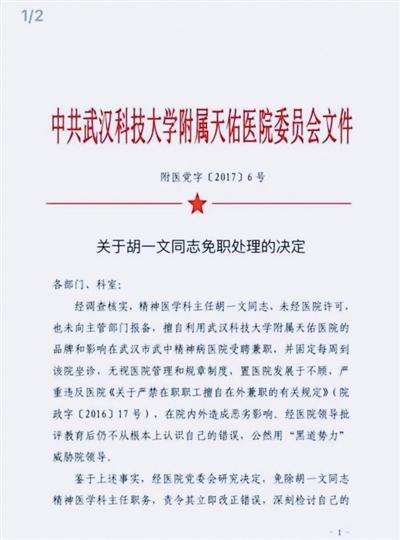 新京报记者获得的一份,由天佑医院党委出具的《关于胡一文同志免职处理的决定》显示,院方认为,胡一文在“未经医院许可,也未向主管部门报备”的情况下,“擅自利用武汉科技大学天佑医院的品牌和影响力在武汉市武中精神病医院受聘兼职,并固定每周到该院坐诊”。