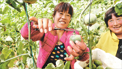 北京市密云区穆家峪镇发挥合作社作用,做大做强特色种养业,助力脱贫攻坚。图为3月15日,穆家峪镇悦民嘉誉种植合作社的村民正在采摘薄皮甜瓜。记者 贺勇 摄