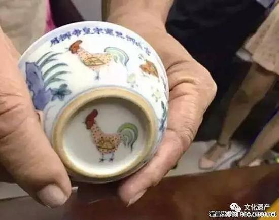 正当老梁将锦旗送到公安局的时候,戏剧性的一幕发生了,四只鸡缸杯全部被认定为赝品。鸡缸杯的底部画着一只大公鸡,并且在口沿写着“宫廷御器宪宗皇帝御用”的古怪款识?!跋茏凇笔浅苫实鄣拿砗?,就是当皇帝死之后,才被追封的名号,敢在皇帝生前御用的杯子上写庙号也确实是病得不轻。