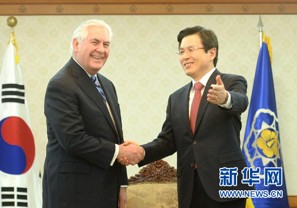 3月17日,正在韩国访问的美国国务卿蒂勒森与韩国代行总统职权的国务总理黄教安在首尔举行会面。 新华社/纽西斯通讯社