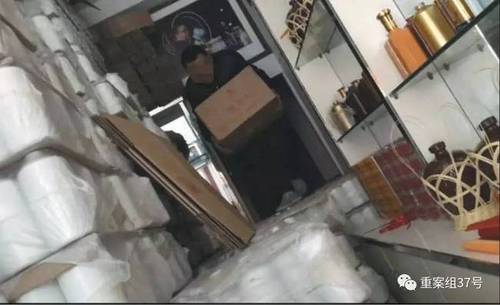 2月18日,翁永成从店里的后屋取出假茅台酒的包装材料。新京报记者游天燚摄