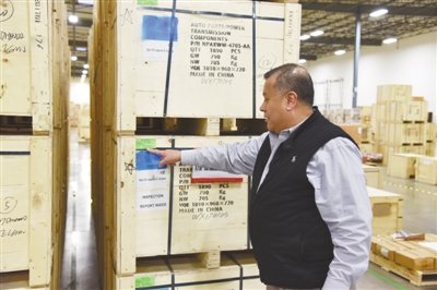 在万向美国公司总部仓库,公司员工赫苏斯介绍从中国运来的货物。记者章念生摄