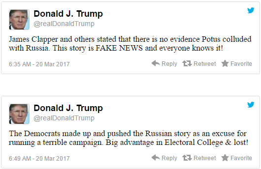 听证会前数小时,特朗普发推表示,“FBI前局长James Clapper等人曾说,总统没有和俄罗斯串通一气。这就是假新闻,大家都知道!”特朗普还说,这则“假新闻”是民主党捏造出来的,只是在为自己输掉了大选找借口而已。