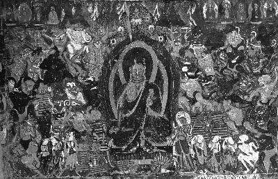 下图为莫高窟第254窟《降魔成道》壁画,上图为陈琦根据壁画绘制的线描画。