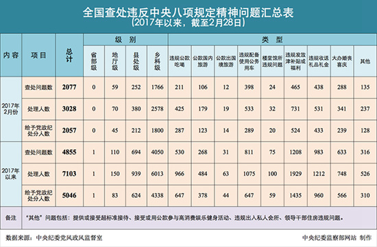 从公布的情况看,2017年2月份查处问题2077起,其中违规发放津补贴或福利465起,违规收送礼品礼金438起,违规配备使用公务用车398起,大办婚丧喜庆288起,违规公款吃喝211起,提供或接受超标准接待、接受或用公款参与高消费娱乐健身活动、违规出入私人会所、领导干部住房违规问题135起,公款旅游118起,楼堂馆所违规问题24起。2月因违反八项规定受到党纪政纪处分的干部中,地厅级45人、县处级212人。