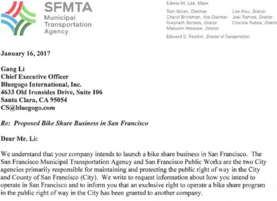 1月16日,在看到中国小蓝可能会在旧金山投放上万辆无桩单车的报道之后,旧金山交通局及旧金山公共工程局负责人联名给小蓝CEO李刚写信,对小蓝提出几点要求,包括:提供运营方案、遵守有关法律、在道路上安装任何设施必须先获得许可、获得工商许可,以及由于旧金山已经与另外一家公共单车企业(Motivate)达成了10年的排他性特许经营协议,小蓝的经营活动不得与特许协议相冲突。