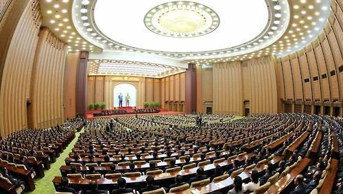 资料图:图为朝中社发布的2016年6月29日举行的第13届最高人民会议第四次会议现场照。
