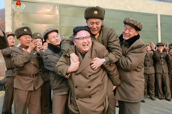 以这种方式与有功人员"互动",在金正恩此前的各种视察中并不多见。从图片中可以看出,身穿军大衣的金正恩一手托住一科研人员的腿,另一只手握住了该科研人员的手,将该名工作人员背上了自己的后背,被金正恩背起的工作人员脸上神情似乎略显紧张。