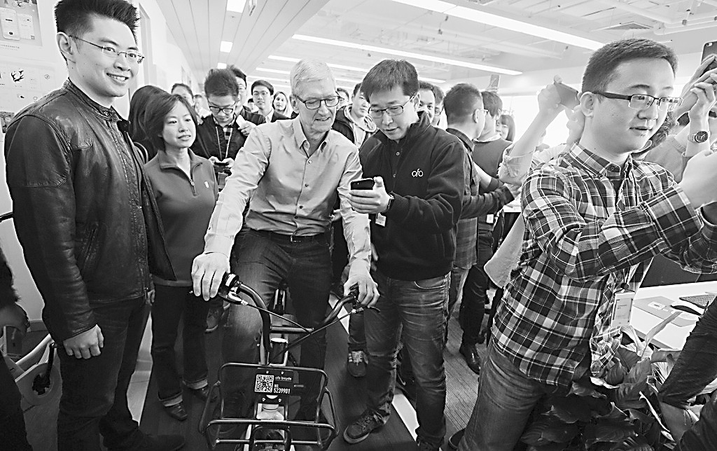 北京时间21日上午,苹果CEO库克现身位于北京海淀区中关村的共享单车ofo总部。照片显示库克在ofo试骑了小黄车(如图)。CNBC报道称,库克再次到访北京,访问对象包括目前风头正劲的共享单车平台。有消息称,去年5月,苹果曾入股滴滴,而滴滴又是ofo的投资方,借此苹果可能将选择新的战略投资对象。