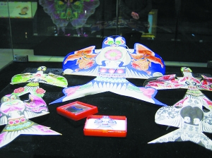 在潘家园非遗展上,由北京“金马”派风筝第三代传人吕铁智制作的超长风筝,长约300米,由50个不同的京剧脸谱组成,宛如祥龙盘旋在展厅上空,吸引游客朋友驻足观赏。