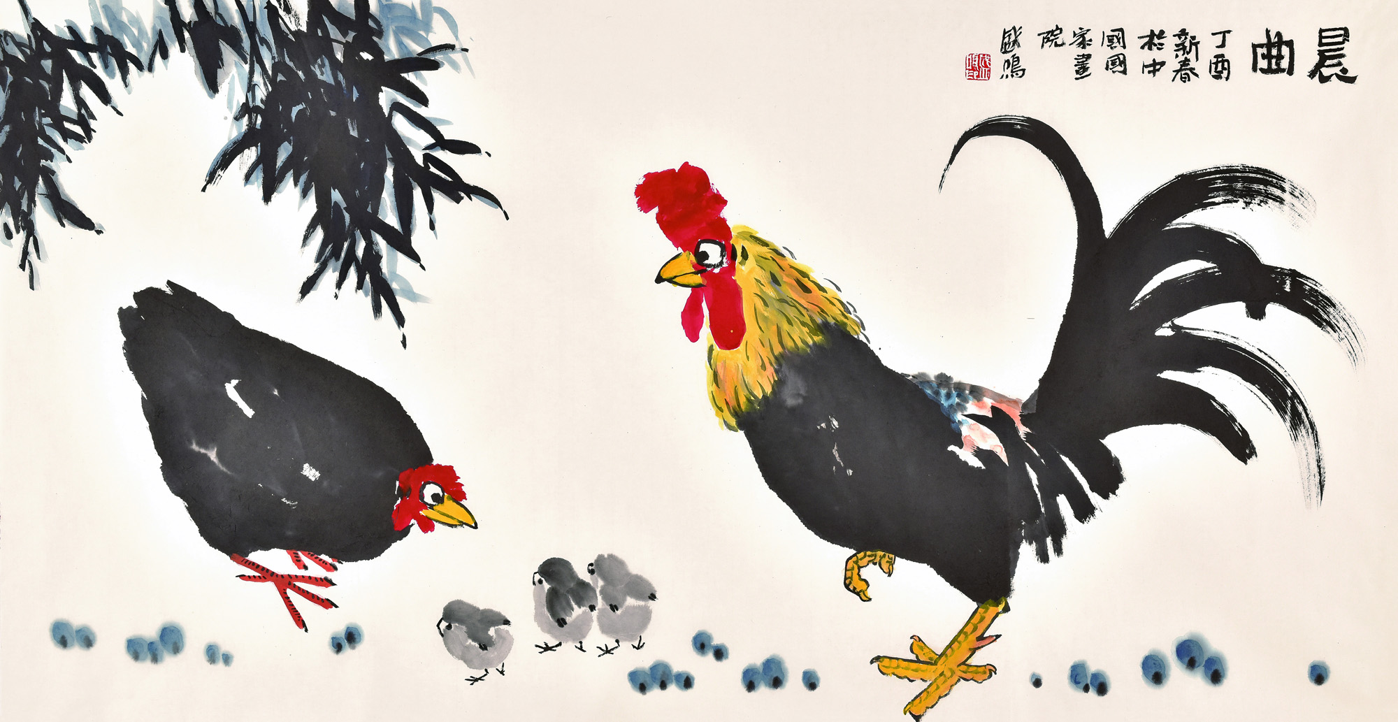 从小生活中北京,北京人讲规矩、讲礼仪,崇尚生存智慧,所以也风趣幽默,这对我的画风有极深的影响。我虽主攻山水,但一直喜欢画鸡,我觉得我的名字跟雄鸡好像也有点关系,再者鸡的性格我也喜欢(鸡有五德,我基本上都占了,但不能叫早,因为现在我的生物时间和鸡正好相反,晚上画画,早上起不来)。虽然我50多了,但画画的兴趣却越来越浓,虽说是喜欢,但还是有一种责任着支撑着。