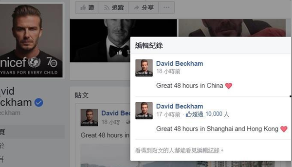 眼看双方网友不断互呛,贝克汉姆在发文后不到一小时,立即将原先写的“Great 48 hours in China”改为“Great 48 hours in Shanghai and Hong Kong”(在上海和香港很棒的48小时),他此行确实先到上海再飞香港,希望能平息这场意外掀起的战火。