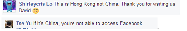 有香港网民留言称,“香港不是中国”“这里是香港”“欢迎大卫到访,但请记得,这是香港”,甚至有人讽刺说“除非内地网友翻墙,否则根本看不到你的发文”。