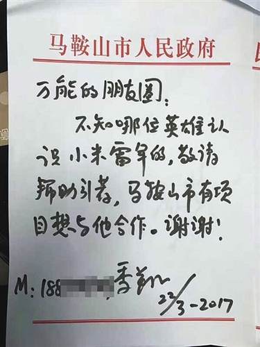 3月22日,季翔在一张抬头是"马鞍山市人民政府"的信笺上,用黑色马克笔手书:"万能的朋友圈:不知哪位英雄认识小米雷军的,敬请帮助引荐,马鞍山市有项目想与他合作。"