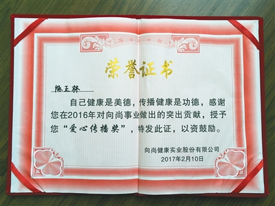 向尚颁发给陈正林的荣誉证书。摄影记者 罗芊