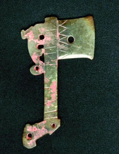 璧是由辟而来,辟即为戉。在红山文化、大汶口文化和良渚文化中,都发现过璧形戉,也许透露出了一个信息:璧与戉之间本来是可以画等号的,都是王权的体现。在石家河文化陶器上刻画有持戉人像,也许描绘的是王的形象,戉是王权的象征。