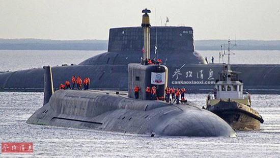 图为俄海军新、老两代战略导弹核潜艇,北风之神级(前)与台风级(后)合影照。