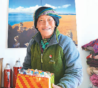 2月14日,71岁的藏族老人次仁央宗在拉萨市达孜县金叶敬老院藏式平房里。新华社记者普布扎西摄