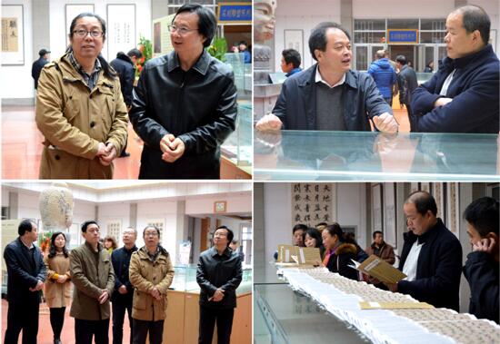 (图:张振国陪同淄博市书协副主席耿毓亮、青州市文物局副局长、青州市博物馆副馆长杨华胜等领导和来宾们参观展览)