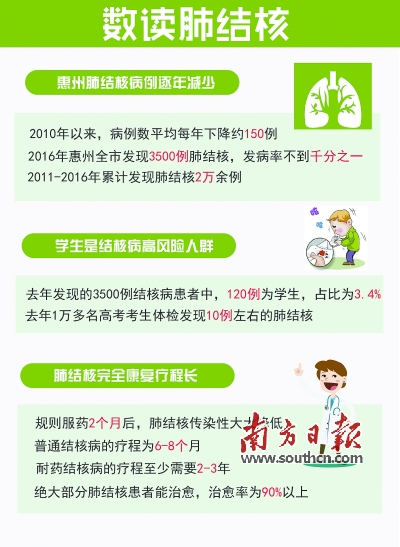 惠州市第一人民医院健康管理中心主任彭可同样为这一论断提供了数据支撑。该院长期以来负责惠州市直高中的高考体检工作,据彭可透露,肺结核是高三学生在体检中检出异常最多的病症,2016年共有1万多名考生由该院组织体检,其中发现10例左右的肺结核。