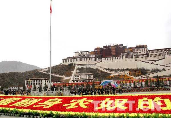△在布达拉宫广场举行升国旗、唱国歌仪式,隆重纪念西藏百万农奴解放58周年。