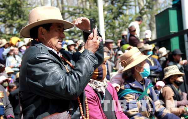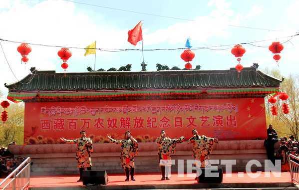 升国旗、唱国歌仪式结束后,西藏自治区文化厅主办的“庆祝西藏百万农奴解放纪念日文艺演出”于上午11点整在龙王潭公园举行。