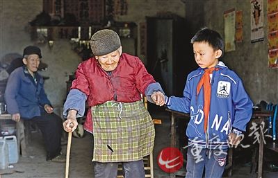 孝顺的谭陆森牵着曾祖母出门晒太阳。