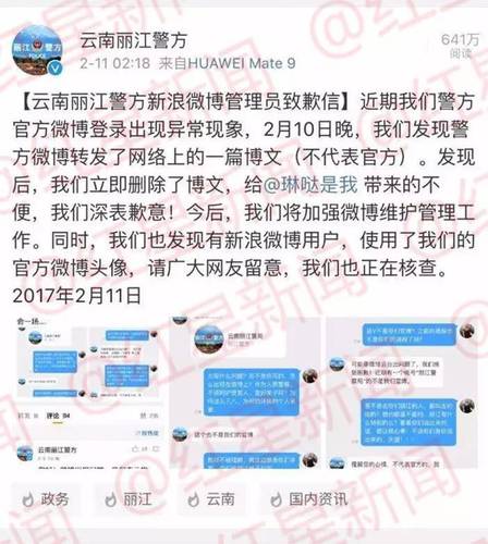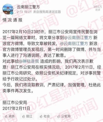 2月11日凌晨,丽江警方发布致歉信,称当时官微出现异常情况,并删除了相关内容。当天晚上7时21分,丽江警方再次发声,称是丽江市公安局宣传民警在浏览网络文章时误发,并对涉事民警给予行政记过处分?!罢馐欠贪?,是诬陷?!毙《?。