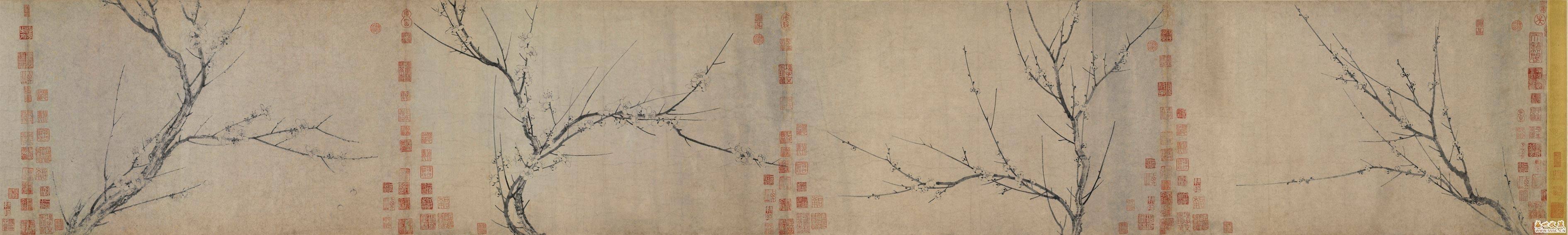此卷曾经《铁网珊瑚》《清河书画舫》《珊瑚网书画跋》《过云楼书画记》《式古堂书画汇考》《大观录》等著录。嘉庆初年为陆谨庭所得,专门筑“四梅花阁”以庋藏之。后流落于外邦,被程桢义用“番钱三百枚”购回,当时传为艺林盛事。又有元吴镇,明沈周、文徵明、项元汴等人收藏印记,前后多达三百余方,是扬无咎一件流传有绪的名迹。文/孙松潭