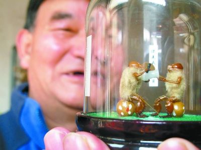 这种形状酷似毛猴的传统手工艺由蝉蜕做头部和四肢,辛夷(玉兰花骨朵儿)做身子。孙怀忠的作品根本留不住,都被热爱毛猴的人收藏了。