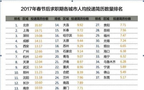 此外,在求职者人均投递简历城市排名的前十位中,成都、西安、广州、杭州、天津、武汉、郑州等都榜上有名。