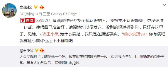 因微博用户“王小呆V”与“八卦壹姐V”在各自微博空间陆续发布谣传高晓松与影视演员郑爽谈恋爱的信息,高晓松将新浪微博平台公司及微博账户持有人起诉至法院,要求停止名誉侵权、赔礼道歉并赔偿损失。日前,海淀法院一审判令“王小呆V”账号持有人在个人微博账户连续15日发布致歉声明,支付精神损害抚慰金50000元及公证费5000元、律师费20000元。同时判令“八卦壹姐V”持有人向高晓松致歉并赔偿损失。(3月30日法制网)