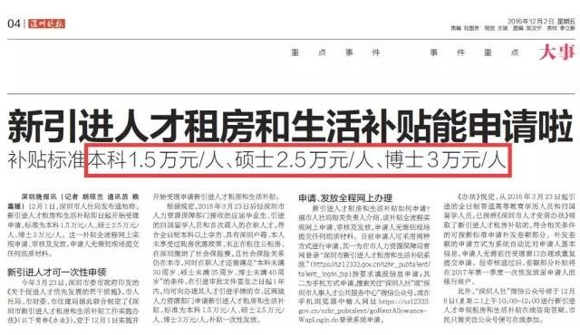 2016年12月1日起,深圳正式开始受理新引进人才租房和生活补贴申请,补贴标准为:本科15000元/人,硕士25000元/人,博士30000元/人,补贴一次性发放。这个让不少“北漂”和“沪漂”们羡慕不已。