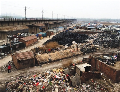 4日,环保部巡查组走进天津市北辰区占地约600亩的“垃圾村”,发现路两旁垃圾堆积如小山。王亚京供图