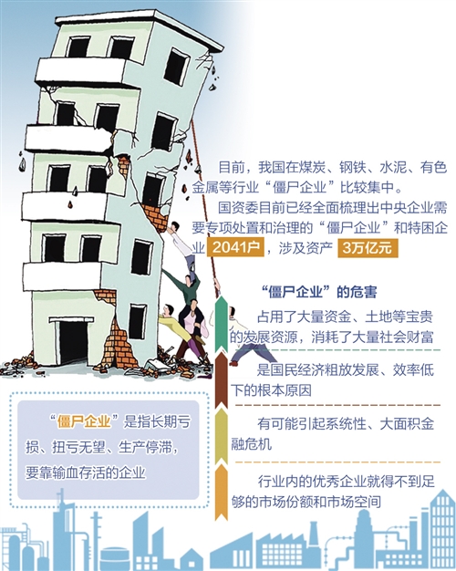 “僵尸企业”是经济学家彼得·科伊提出的一个经济学概念?!啊┦笠怠侵改切┏て诳魉稹⑴た魑尥?、生产停滞,要靠输血存活的企业。这些企业消耗了大量资源,给社会造成了不稳定因素,使得我国结构调整、转型升级步伐难以积极推进?!敝泄笠盗匣岢N窀被岢ぜ胬硎鲁ぶ旌耆谓邮芫萌毡āぶ泄猛钦卟煞檬彼怠?/p>