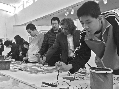 中国美术馆馆长吴为山与自闭症孩子一起作画