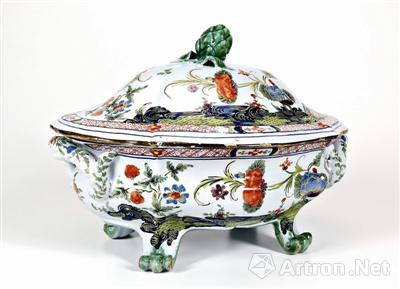 展品中有一个十六世纪的锡釉陶碗,就是采用了明朝青花瓷的画风,地盘花环中央画有一枚贝壳,而贝壳在马可波罗时代象征着瓷器。另有一个十八世纪的锡釉陶盘,宽大的底部画面为东方园林胜景,主体为湖边一座塔,树木花朵郁郁葱葱,具有明显的“中国风”。还有一件带盖汤窝,画面就是一个虚构的中国花园,大朵红花描绘在蓝色草地上。