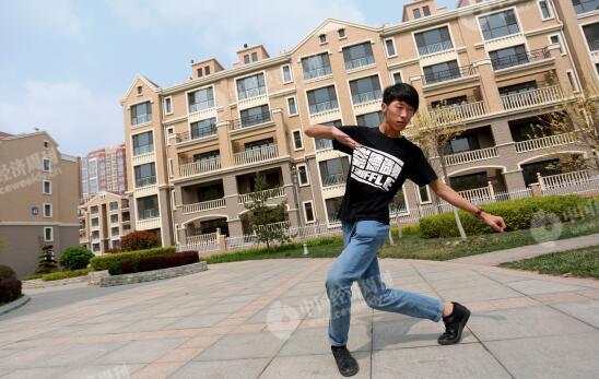 张鹏在自家的小区内跳舞。他每天晚间在雄州公园广场上开设舞蹈培训班。