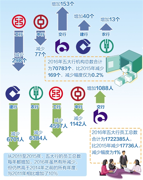 年报显示,2016年五大行机构总数合计为70783个,比2015年的70952减少169个,降幅0.2%?!跋呦峦愕淖芰课蠢椿嵫顾?功能从结算交易型向营销智能服务型转变。”易会满说。