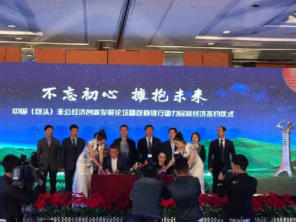 近年来,包头市鼓励、支持、引导非公有制经济发展,不断优化发展环境。经济发展,金融先行,发展非公经济离不开金融的鼎力支持。论坛期间,包商银行与内蒙古蒙草生态环境(集团)股份有限公司、小尾羊牧业科技股份有限公司、明华能源集团有限公司、明拓集团有限公司、东方希望包头稀土铝业有限责任公司、阿特斯阳光电力集团等六家民营企业签订了战略合作协议。