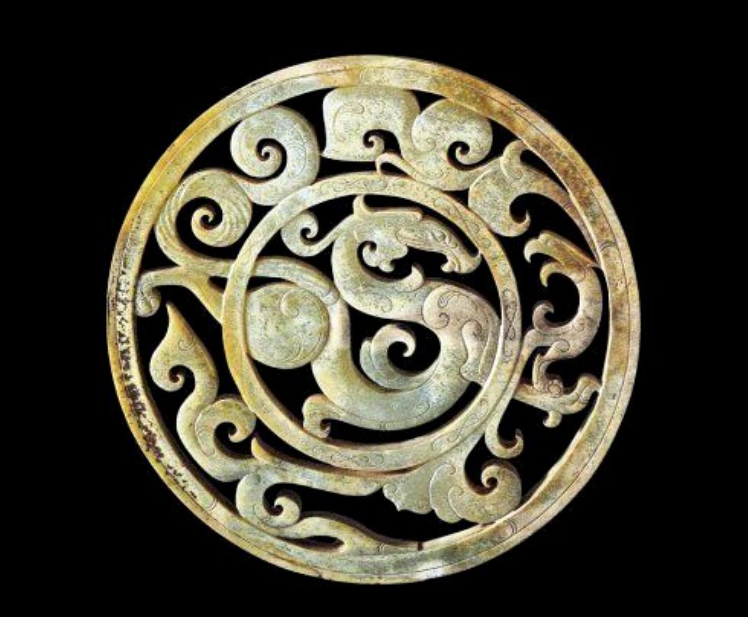 龙凤拱璧的艺术意境,在汉代得到承袭,也有一些新的变通。战国时期的龙凤多出现在璧外沿,汉代则璧内外都有龙凤身影,构图更为活泼灵动。如广州南越王墓出土一龙一凤玉佩、三凤玉璧、一龙二凤玉璧、双凤玉璧,构图多样。有一件一龙二凤璧,外有二凤拱璧,璧心一龙昂首挺胸,气势不凡。