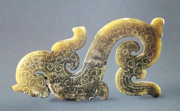 更奇特的是一种S形玉佩,也是龙凤同体,龙首凤尾。如山西太原赵卿墓所见两件玉佩,尖状龙尾如凤喙,圆眼刻画很明确。