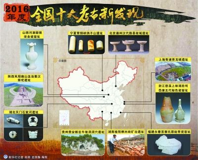 其他9大新发现分别是宁夏青铜峡鸽子山遗址、贵州贵安新区牛坡洞洞穴遗址、湖北天门石家河遗址、福建永春苦寨坑原始青瓷窑址、陕西凤翔雍山血池秦汉祭祀遗址、浙江慈溪上林湖后司岙唐五代秘色瓷窑址、上海青浦青龙镇遗址、山西河津固镇宋金瓷窑址和湖南桂阳桐木岭矿冶遗址。