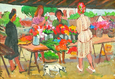 在中国美术馆,藏有潘玉良在20世纪40年代创作的《花摊》《瓶花和水果》《周晓燕肖像》《自画像》《窗前的女人体》等油画作品。其中《花摊》描绘的是巴黎街头常见景物,其以花棚内为视点,以卖花女为背景,通过购售鲜花的情境,表现了巴黎妇女的生活习俗,也体现了画家对人生、对自然、对美的热爱。画面中,她弱化了购花人的色泽,却以原色点染了虽在阴影中却依然明亮的鲜花。一只黑白的小花狗在花摊前跑来跑去,更活跃了画面气氛。画家用中国水墨画线描技巧速写般地记录了卖花女的姿态,在笔端里浸透着她对祖国传统艺术的一番情愫。