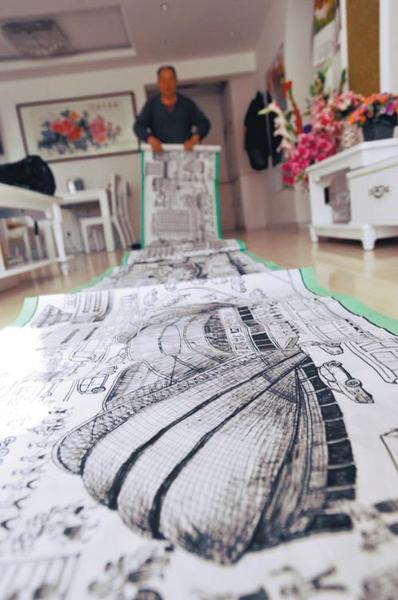 广场上,人们高兴地唱着、跳着。一旁,有人拍照,有人拍手。不远处,从售楼处走出来的几位市民露出了笑脸。路边的水果超市生意红火,一位推着婴儿车的妈妈开心地走过,买菜的老邻居正投入地唠着嗑。马路上,车辆有序奔驰……这样生动的画面,多彩的生活,在12米的工笔画长卷中,仅仅是一小部分。近日,67岁的邱恩祥带着自己的作品参加了首届“幸福沈阳”全民书画大赛。这幅潜心一年多的巨作不仅晒出了他的家乡巨变,也晒出了如今的幸福沈阳。
